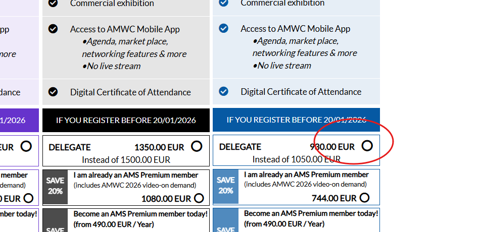 1. Log in to your personal account with your email and password* then select the pass you want (click on DELEGATE rate and not on the AMS Member rate):